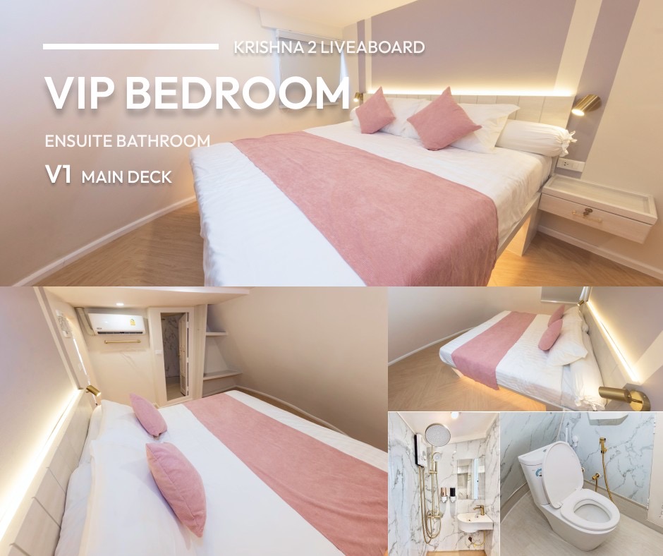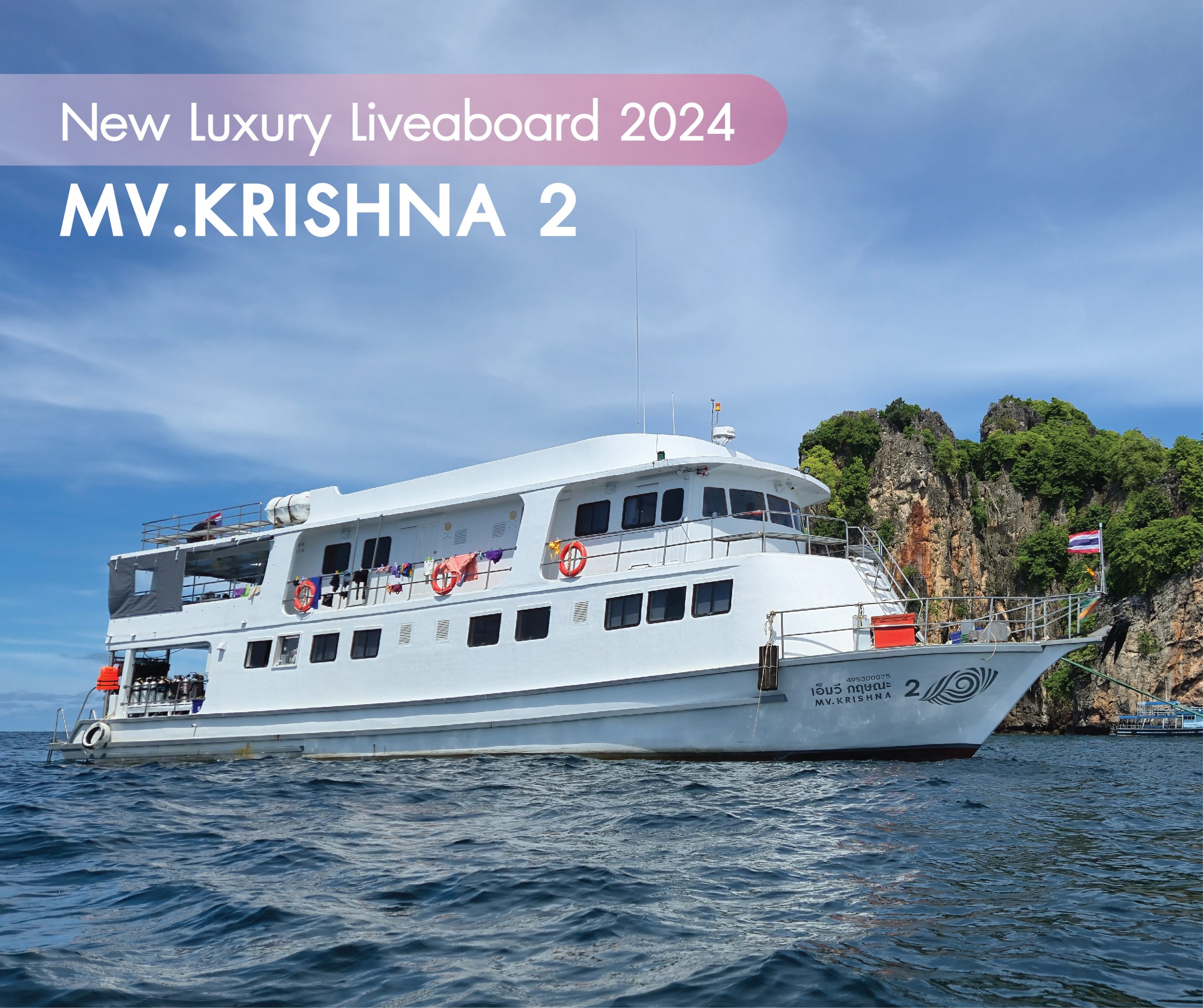 The Krishna 2 is a 26-meter/85-foot-long liveaboard, built in 2024, that offers a comfortable diving experience for up to 24 passengers, supported by a crew of 10 in the Andaman Sea, Thailand. The Krishna 2 features various cabin options: 7 twin ensuite cabins, 2 double bed ensuites, 1 king bed ensuite, and a 4-bunk room accommodating four guests. Each cabin includes hot and cold showers and daily cleaning services. The upper deck consists of the captain's room, a saloon, a living area, and the ensuite queen and twin cabins, while the main deck hosts a kitchen, a public WC, a tank area, and additional cabins.