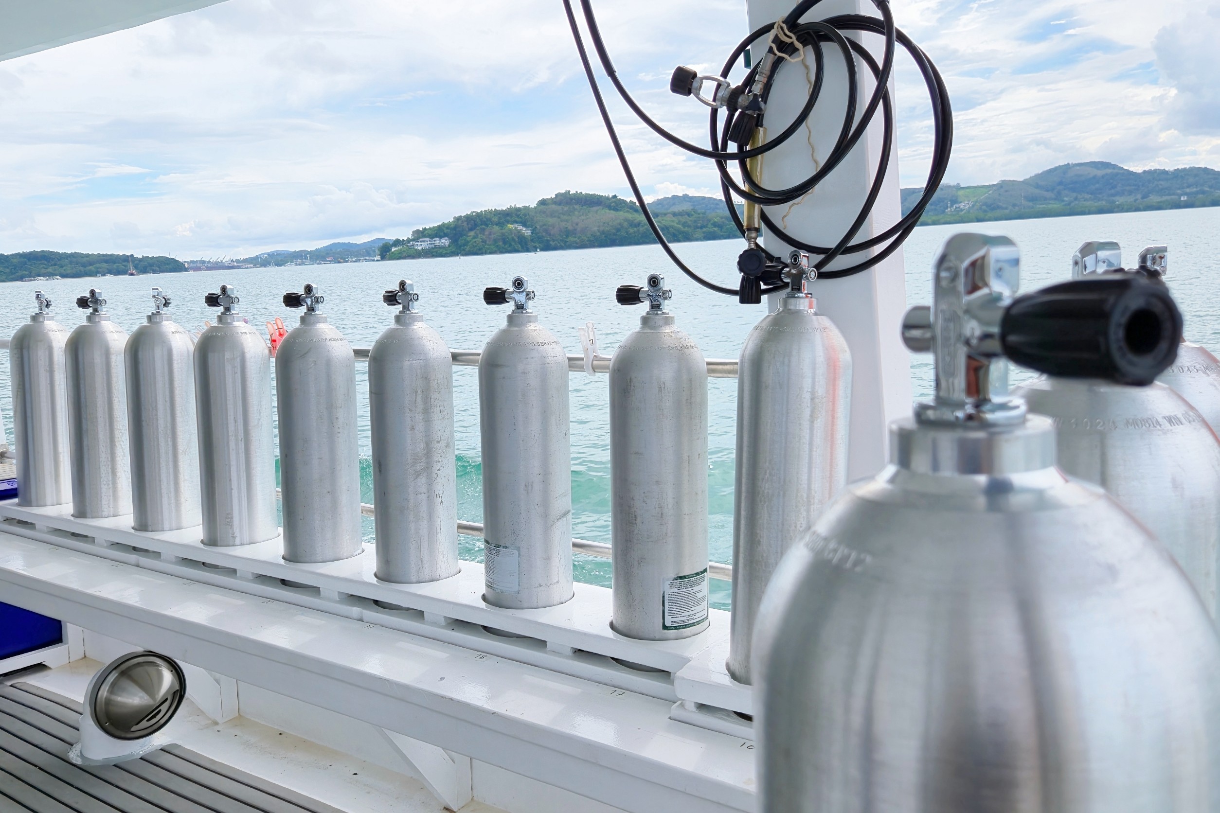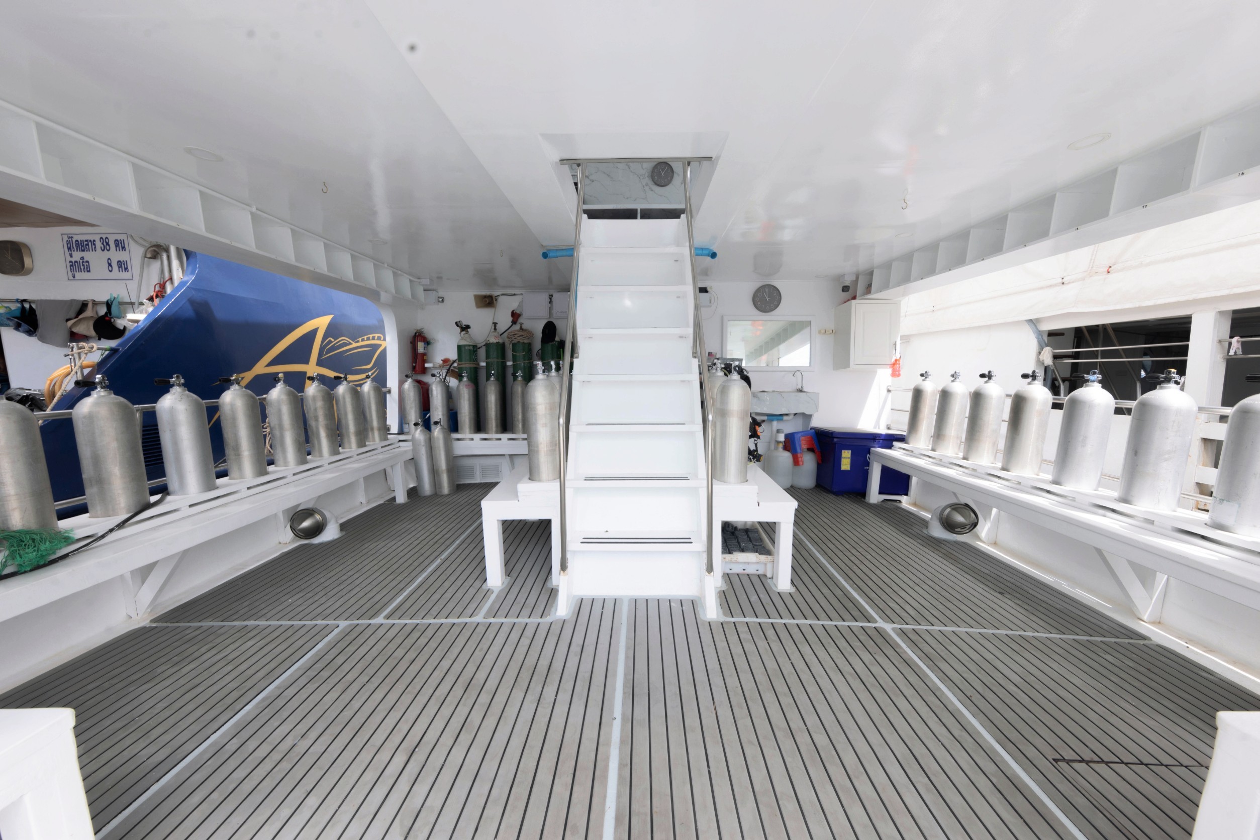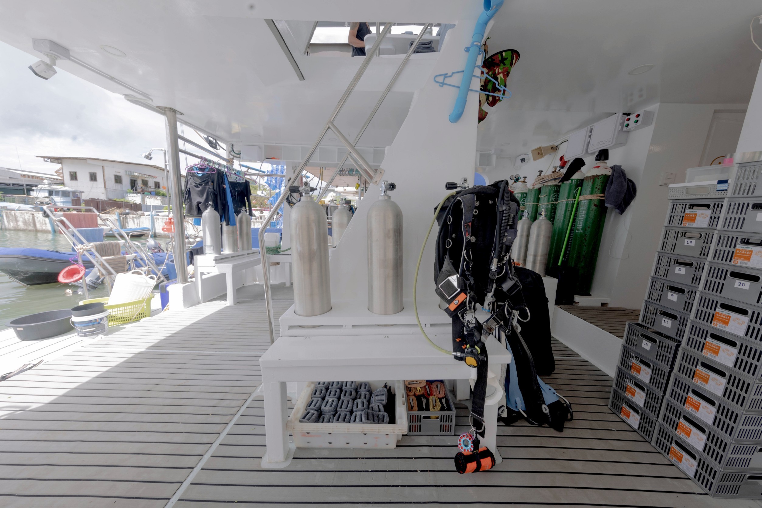 The liveaboard is well-equipped for diving, with a 4.0-meter diving support boat, a high-capacity Bauer air compressor, 30 scuba tanks, and various weights and diving gear available for rent.